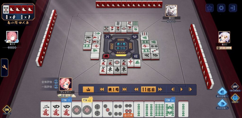 この巡目だと、鳴いての三色アガりが厳しくなるので、そういう印象です。