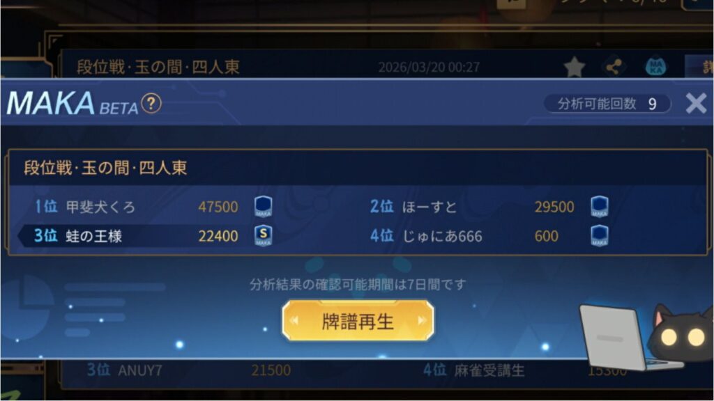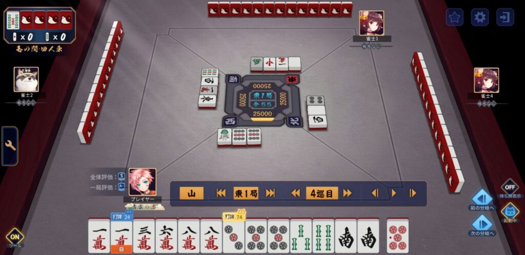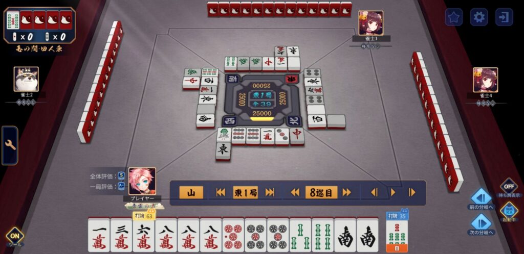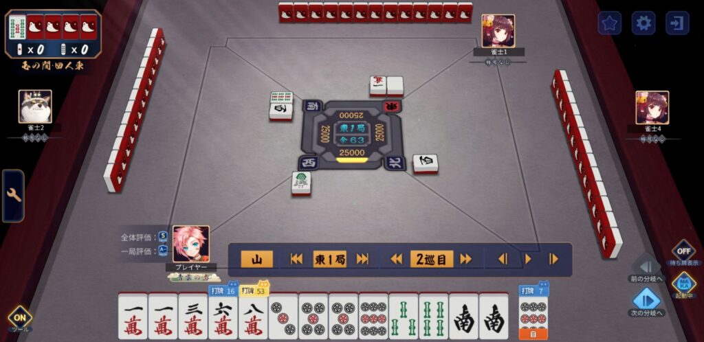 今回は、暗刻近くの浮き牌を残し過ぎて評価が下がりました。